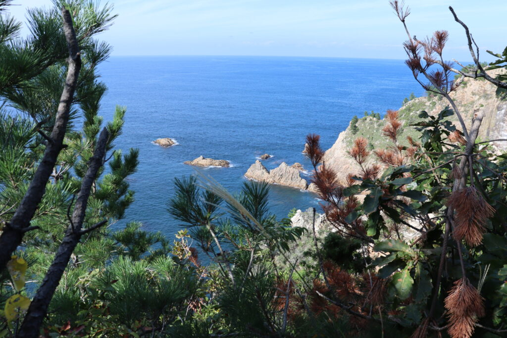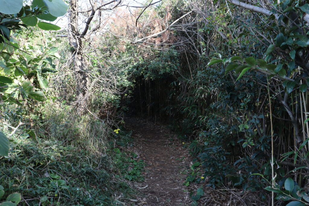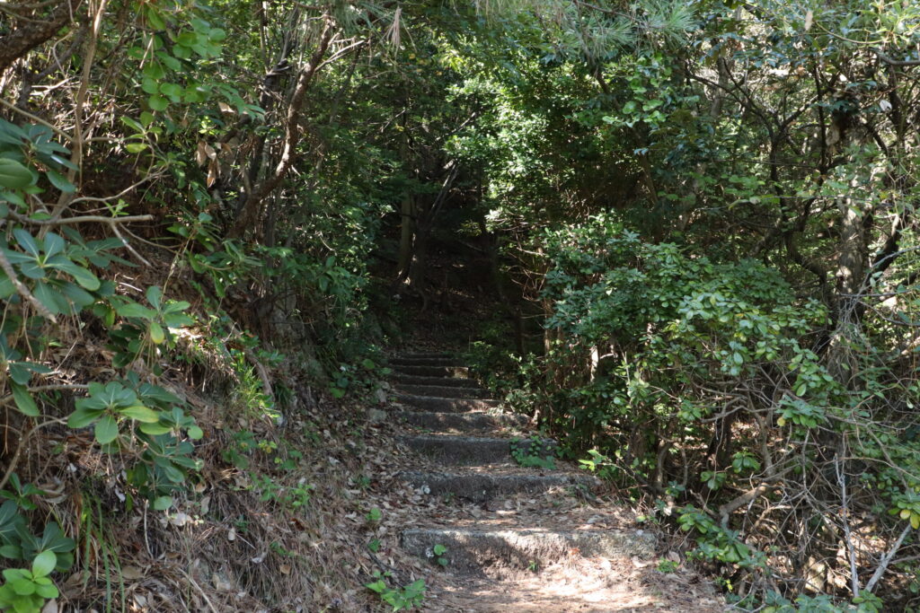 半分崩れたような石段と、上だけでなく横から伸びる草木をかき分けて進む。以前は展望台だったようだが、訪れる人もないのか草木が邪魔して景色よくが見えない。狭い道の海側は絶壁で、反対側は下も見えない樹林。