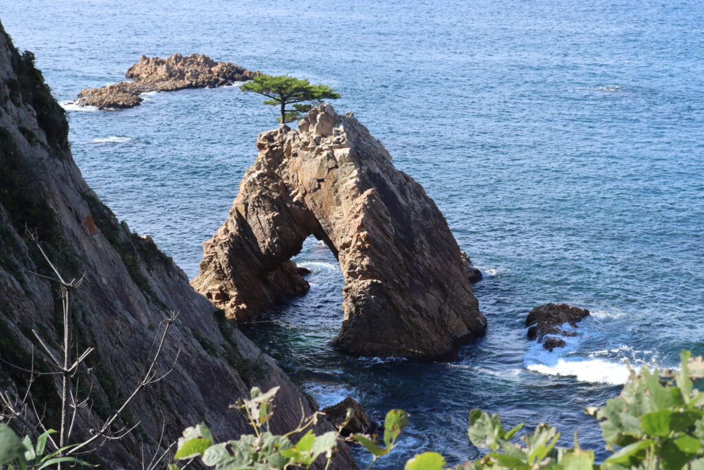 千貫松島は見てきたけど、その先は止めた方がいいですよと言って下りていく。一応階段は付いているが、上方は木々に覆われて薄暗い。またまた秘境かとうんざりしたが、数分で青い海に埋まるような洞門状の奇岩の上に一本の松。
