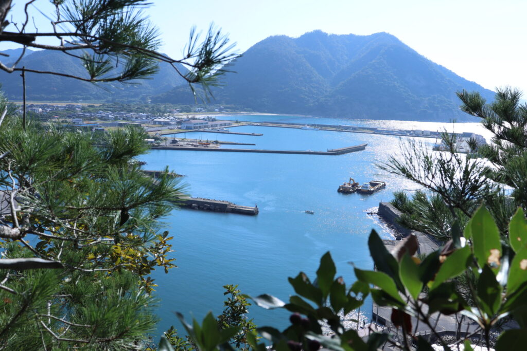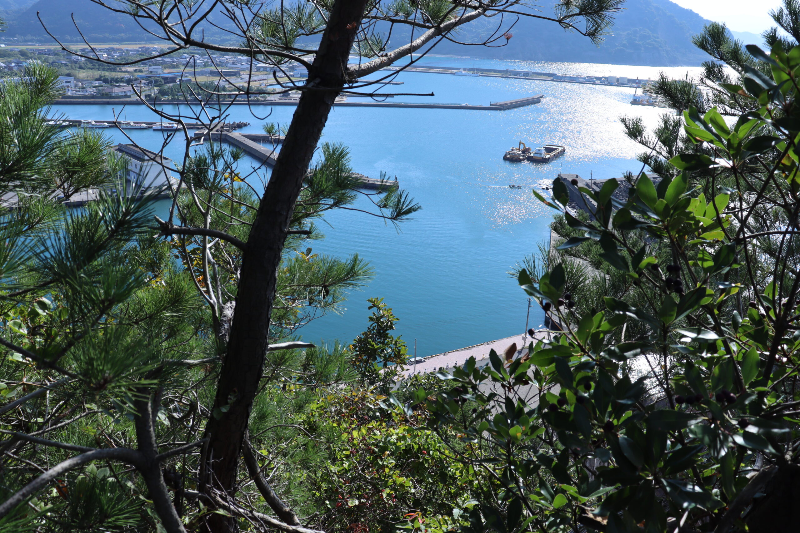 何とかたどり着くと、絶景が待っていた。右手には眼下に広がる青い海と奇岩。左には木々の間に行き交う船と、長く延びる堤防と、網代の町並み。独り占めの絶景を存分に楽しみ、カメラに収めて下山した。