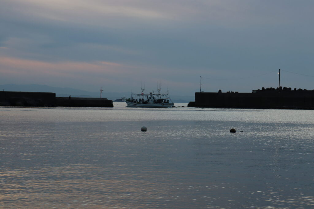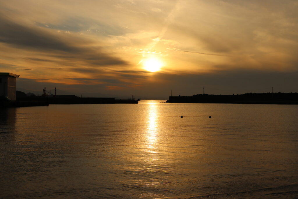 先程と同じように、手前のバス停で降りて歩いて漁港へ向かう。夕陽が落ちて海面にキラキラと水光を延ばしている。しかし、あんなに晴れていたのに雲が多くて、期待していた真っ赤な夕陽には程遠い。