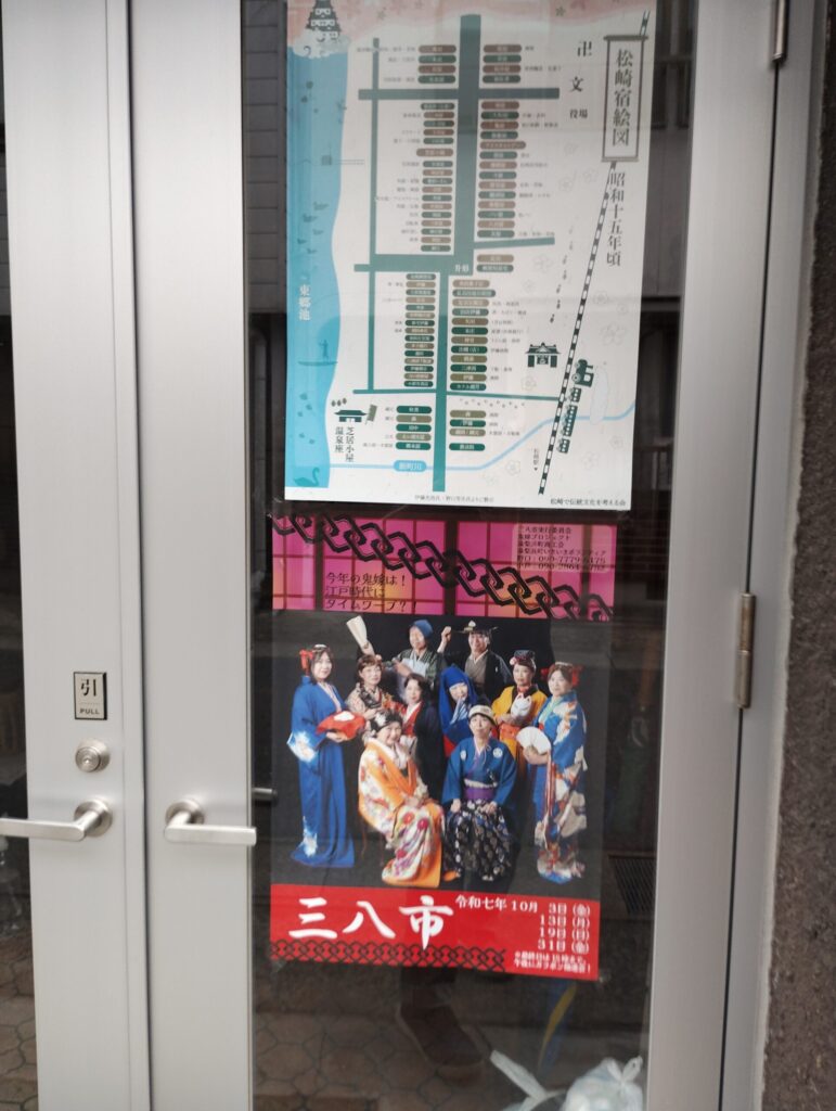 掲示板や商店の入り口に貼ってあるポスターを見ると、往時は駅前から神社へ向かう通りの数百メートルの両側に80軒程の店が並んでいたのが分かる。戦前は農機具や日用品、野菜などを売る朝市、三八市で多くの客で賑わっていたという。