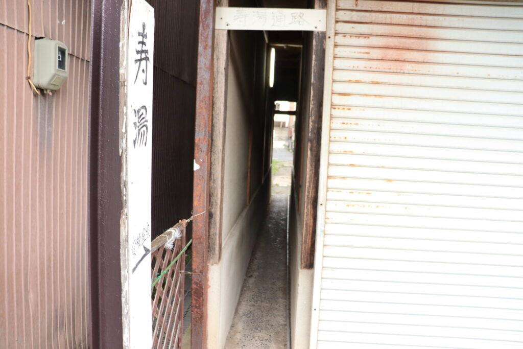 以前、地元のテレビ番組で銭湯があると知っていたが、よく見ると寿湯の文字。カメラとリュックを背負って通れそうもないので、県道に出て裏から回ってみる。民家のような建物に寿湯の看板。覗いてみると無人で、ボタン押してくださいとある。