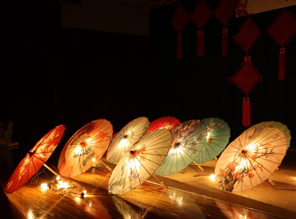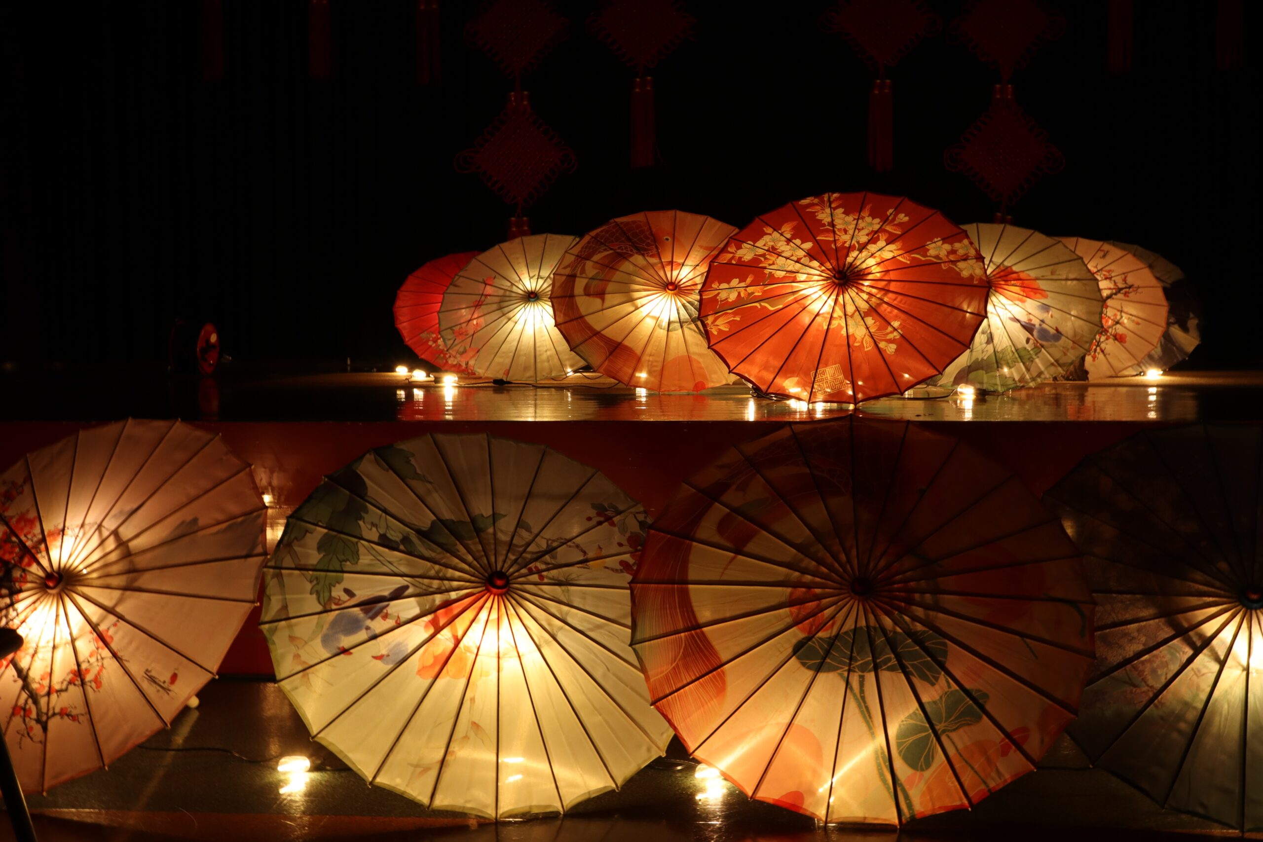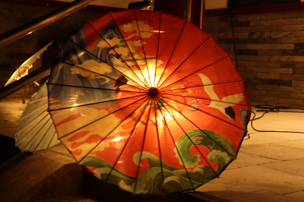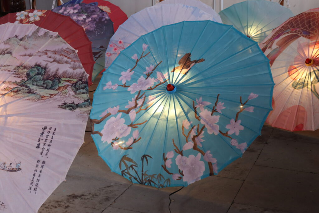 土曜日の夜とあって家族連れやカップルの姿も増えている。暗くなるにつれて灯った中国傘の絵が幻想的に浮かび上がってきた。和傘のライトアップは各地で行われているが、それとは違った興趣が感じられた。
