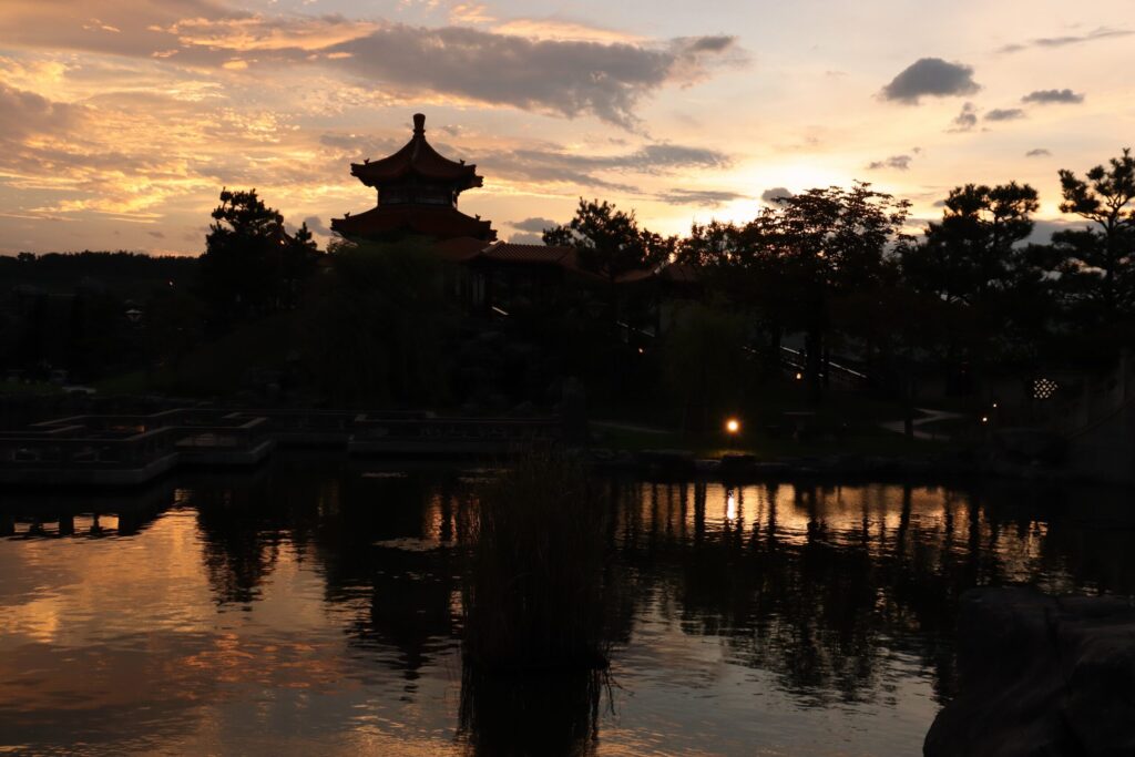 気が付くと池の彼方の山々に陽が沈みかけていた。黄金色に変わっていく夕空と雲。そして燕趙園の建物は影絵のように黒くなり、夕空と共に園内の池に映っている。