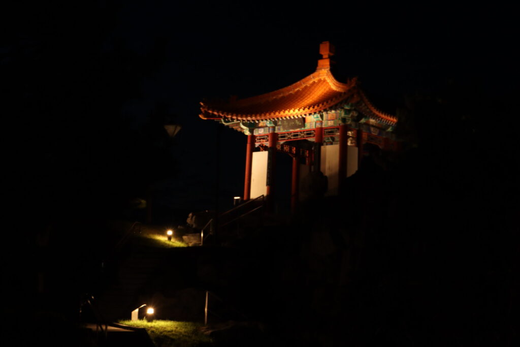 庭園なので、それ程広くはないが、これまで入った事のない隅々まで見学出来た。正門を出て明るい時との違いを切り取るように、灯った中国傘にカメラを向けてシャッターを切る。最後に彩りを眼に焼き付けて帰路に着いた。