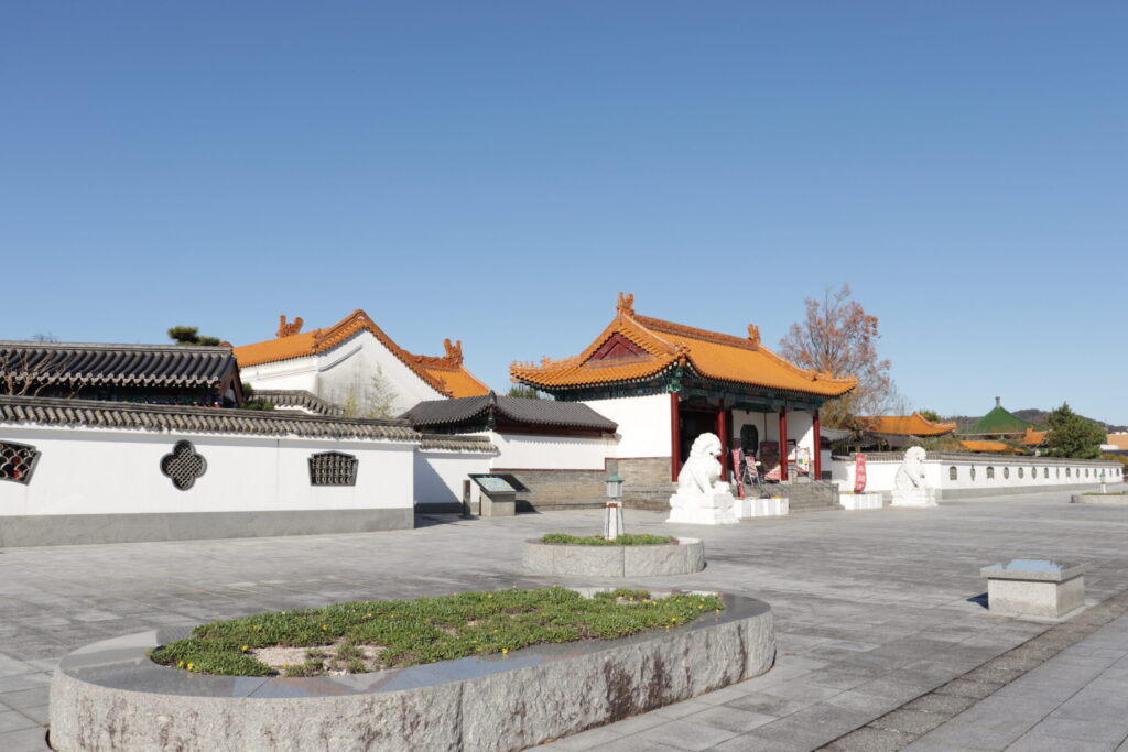 駅から数分の公園で青い空と池にシャッターを切ってスタート。近くのグランピングも青空の下に映えて白く佇んでいる。そして、夏に訪れた燕趙園も鮮やかな彩りを添えていた。少しのんびりし過ぎたので、スピードを上げて右回りに進んでいく。