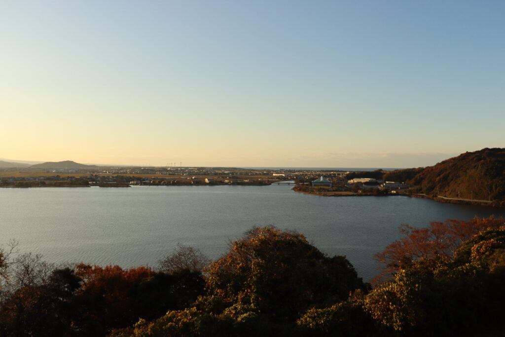 あんまり急ぎ過ぎて、お目当ての展望台へ着いたのは4時過ぎ。真っ青な空と東郷池の水面。湯梨浜の町並みの向こうには十数基の風力発電の白い風車。そして、彼方には中国地方最高峰の大山まで見える絶好のロケーション。