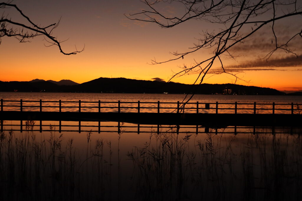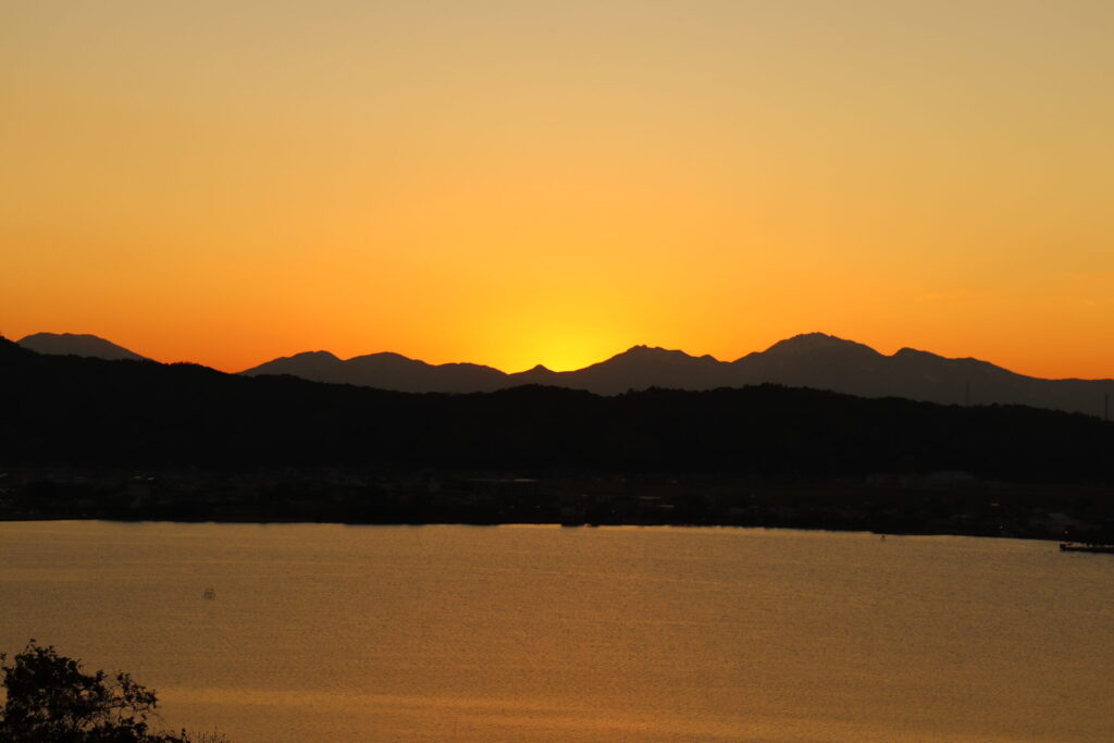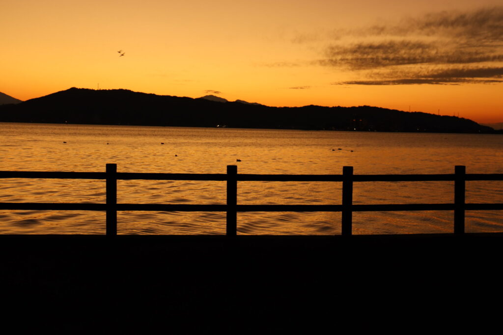 30分程経過して、太陽が彼方の山へと沈みかけていく。それに伴って青から黄色、そして橙色に変わり行く空と東郷池の水面に目を奪われながら、次々シャッターを切っていく。