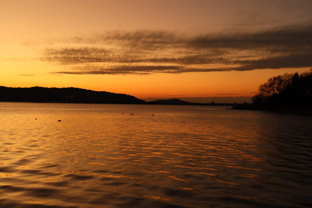晴れていた夕空に筋雲がかかり、山の上と水面を橙色に染めていく。さざ波が立つ水面にどこからともなく水鳥が現れて浮かんでいる。その上を名も知らぬ鳥が舞っている。ようやく秋の夕景の雰囲気に近付いてきた。