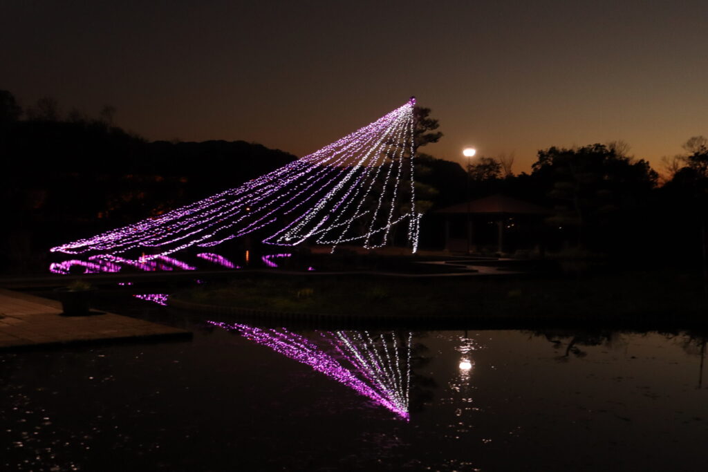 振り返ると、まだ幾らか明るさが残るあやめ池にイルミネーションが点灯している。正直なところ、イルミネーションといってもそれ程期待はしていなかった。名所と言われるスポットの100万球に対して4万球に過ぎないから。