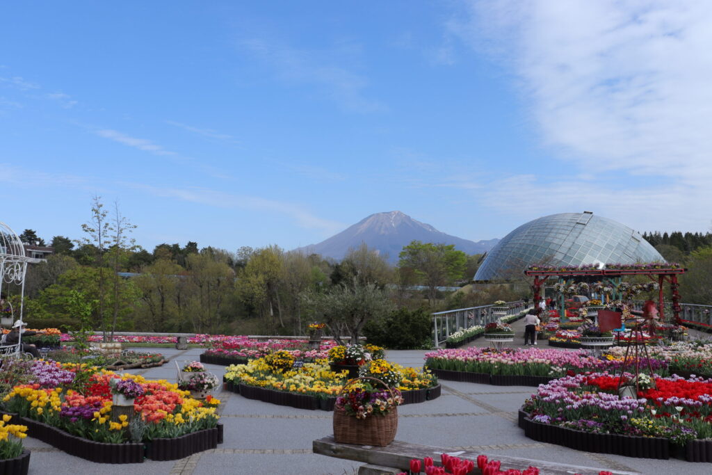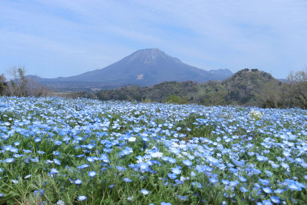 入口からドームまでチューリップで埋め尽くされている感じ。撮影しながらドームへ入り、目に着いた胡蝶蘭を撮って回廊に上がって花の丘へ向かう。大山をバックに今回はパンジーとネモフィラが出迎えてくれた。お目当ては今年初登場のネモフィラ。