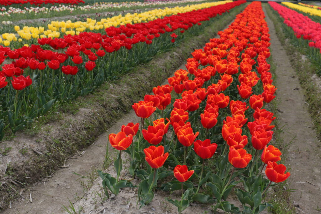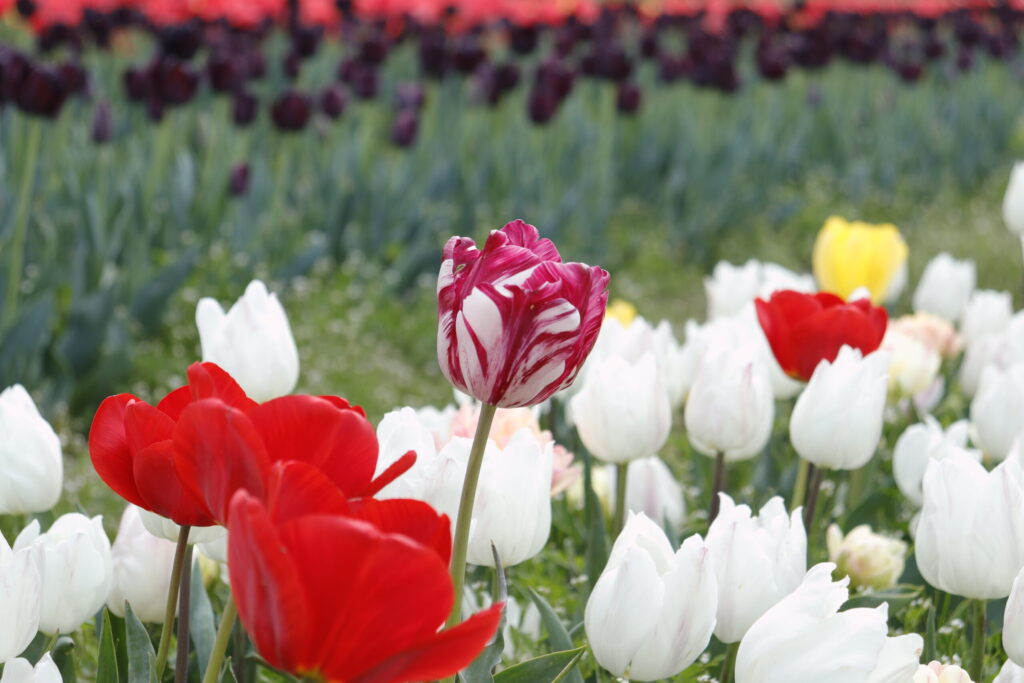 結局、チューリップ畑に着いたのは1時間40分後。更に、予想していた程の規模はない上に天候は曇り。それでも、赤黄白ボルドー等のチューリップが一列に並ぶ様は壮観。親子連れなどで賑わい、シャッターチャンスを掴むのに一苦労。