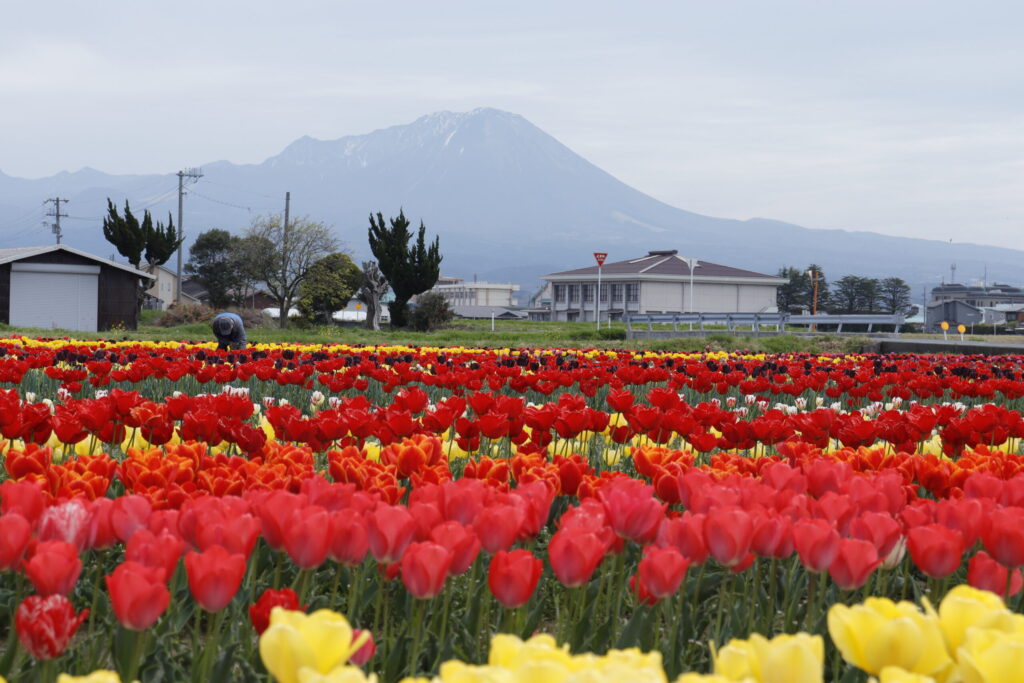 曇りの日の撮影は空を入れると白飛びするので難しい。大山は見えているが背景が曇りなので見栄えがしない。少し青を強めにして何とか撮ったが、チューリップを採るおじさんが紛れ込んでいた。撮り直そうにも何十本も採っていてなかなか動かない。