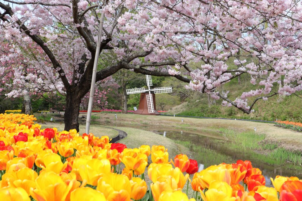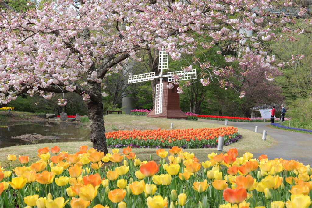 遅咲きの桜と今が旬のチューリップ。そして、その間にある白い風車。絵になる光景だけに多くのカメラマンで順番待ち。その間にたっぷり鮮やかな光景を堪能しながら、撮る位置やアングルを考える。この時間がまたカメラ撮影の楽しみ。