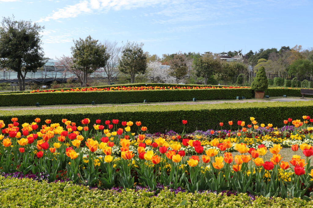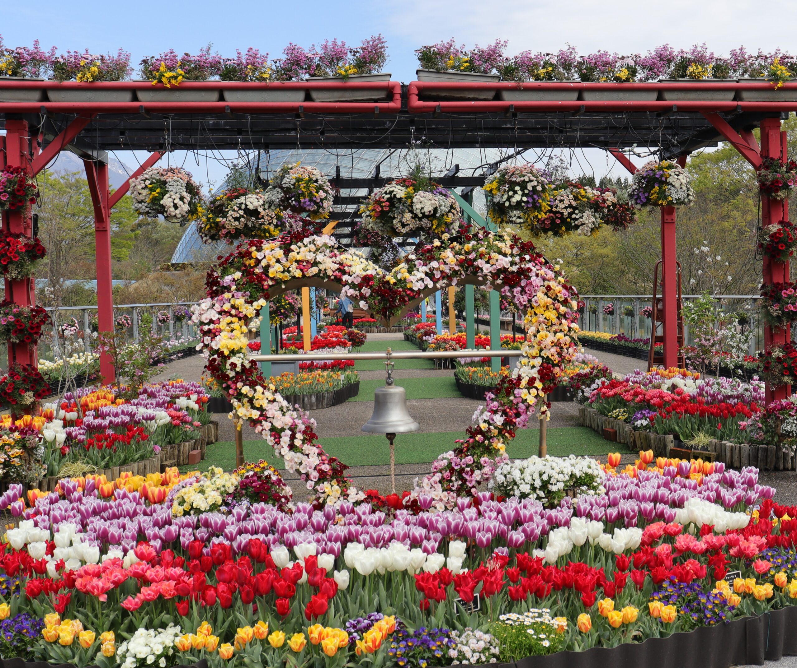 次の電車でやっと目的の米子駅に到着。しかし、とっとり花回廊行きのシャトルバスの時間にギリギリでコンビニで昼の食料を調達。30分で着いた花回廊はようやく青空が見えたが、やはり雲が多い。今回の花回廊のメインはチューリップまつり。