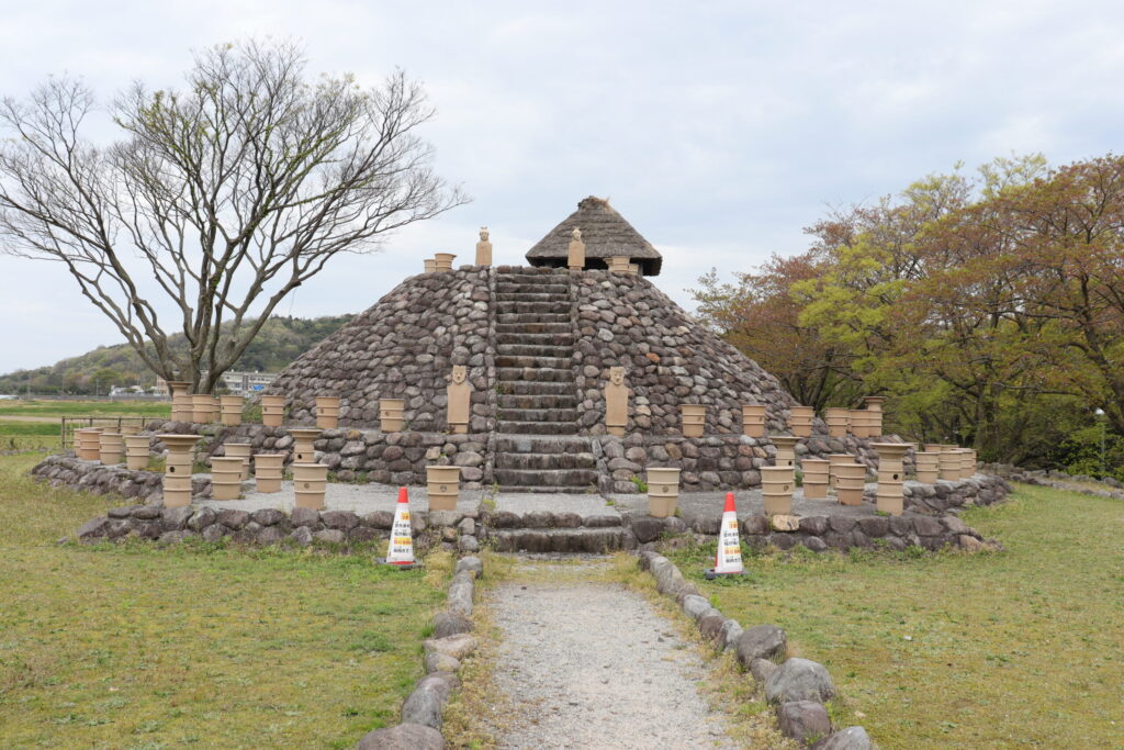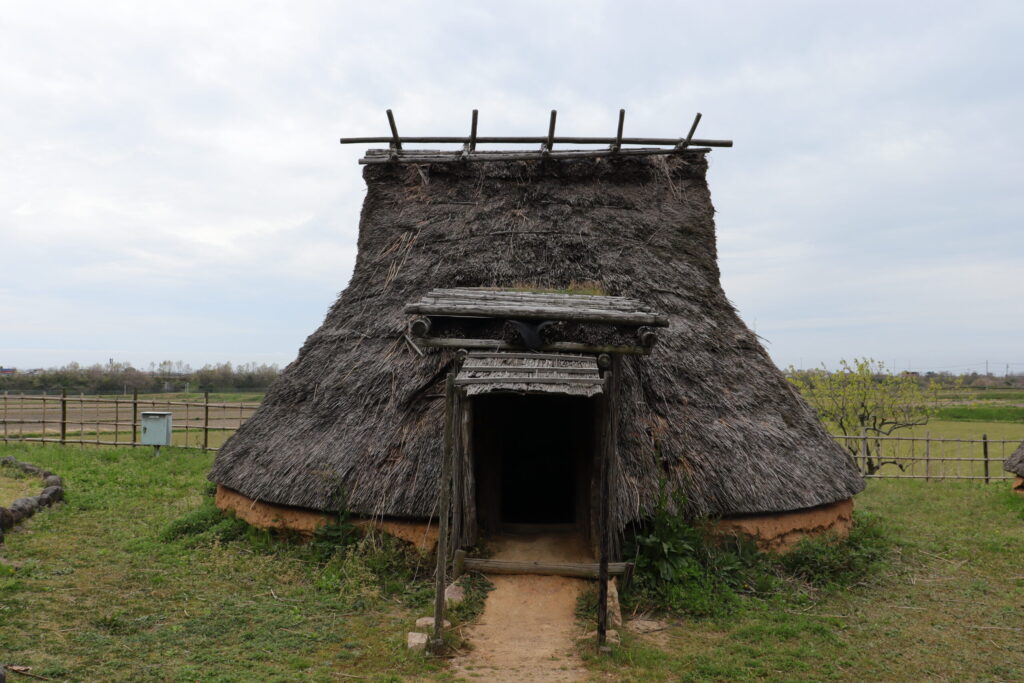 公園のシンボルともいうべき、弥生時代の建物を復元した高床建物が見えてきた。その広い公園に万葉の園、弥生村、古代ハスの園の他、数カ所の広場が設けられている。早速入場して高床建物へ向かうと弥生村に復元した竪穴住居が2棟。