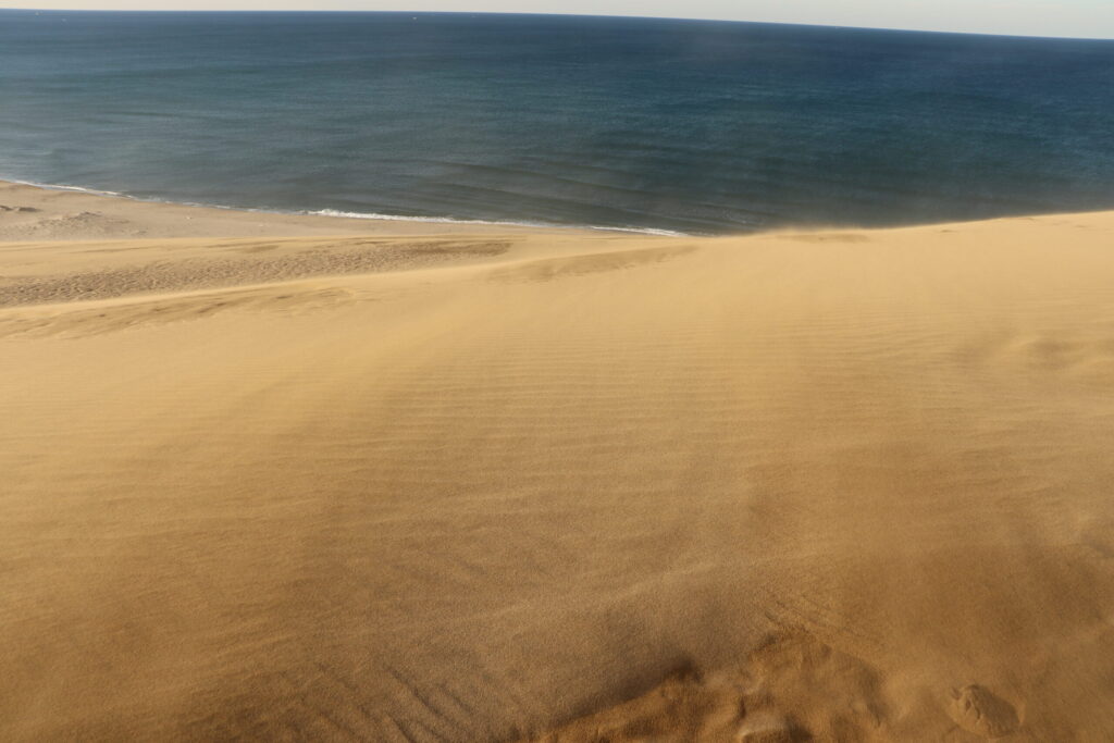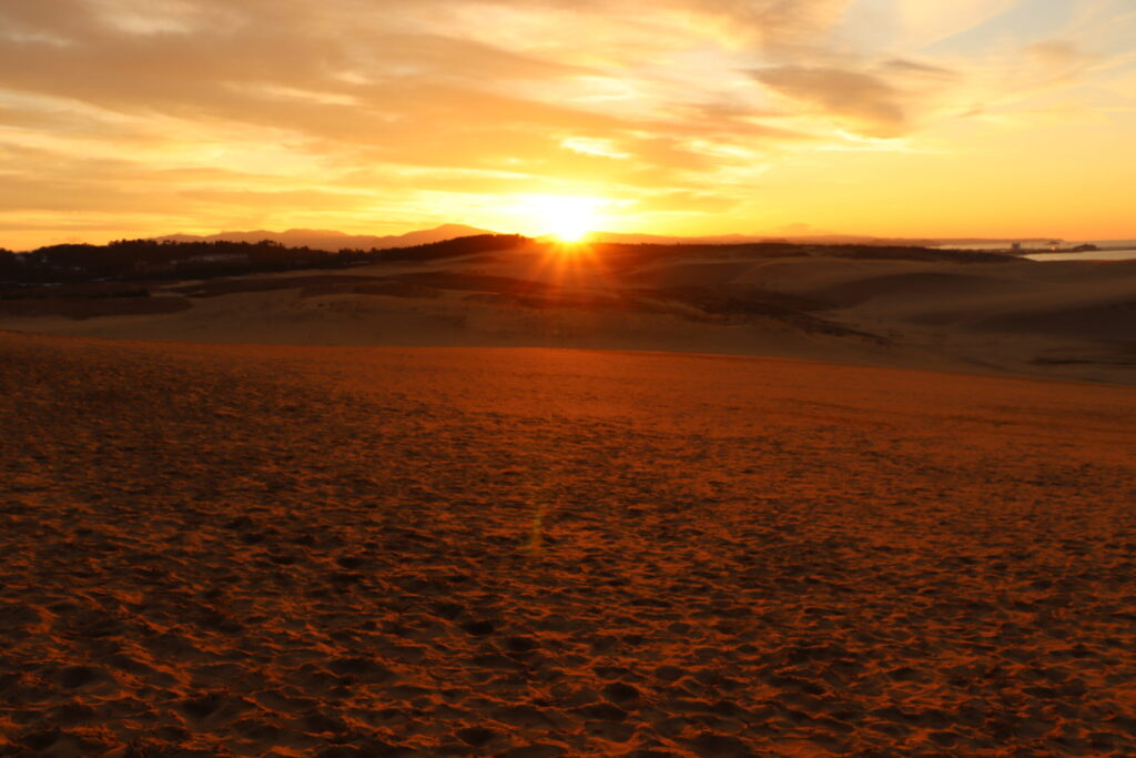 冬の夕陽が沈む瞬間の鳥取砂丘