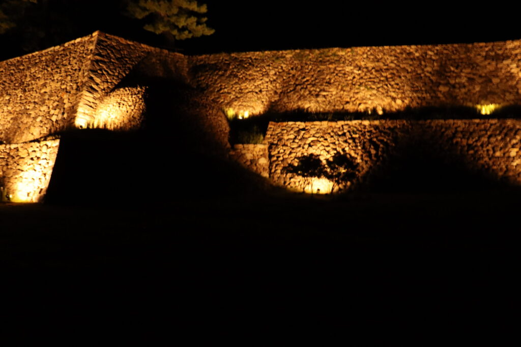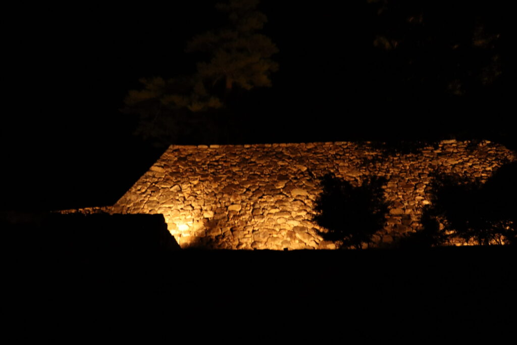 石垣はライトアップされているが、足下は真っ暗でゴロゴロ転がっている石に躓いたら怪我になりかねない。それでも、広大な石垣や、全国唯一とも言われている球形の巻石垣が暗い中で光彩を放つ光景は貴重な撮影ポイントになった。