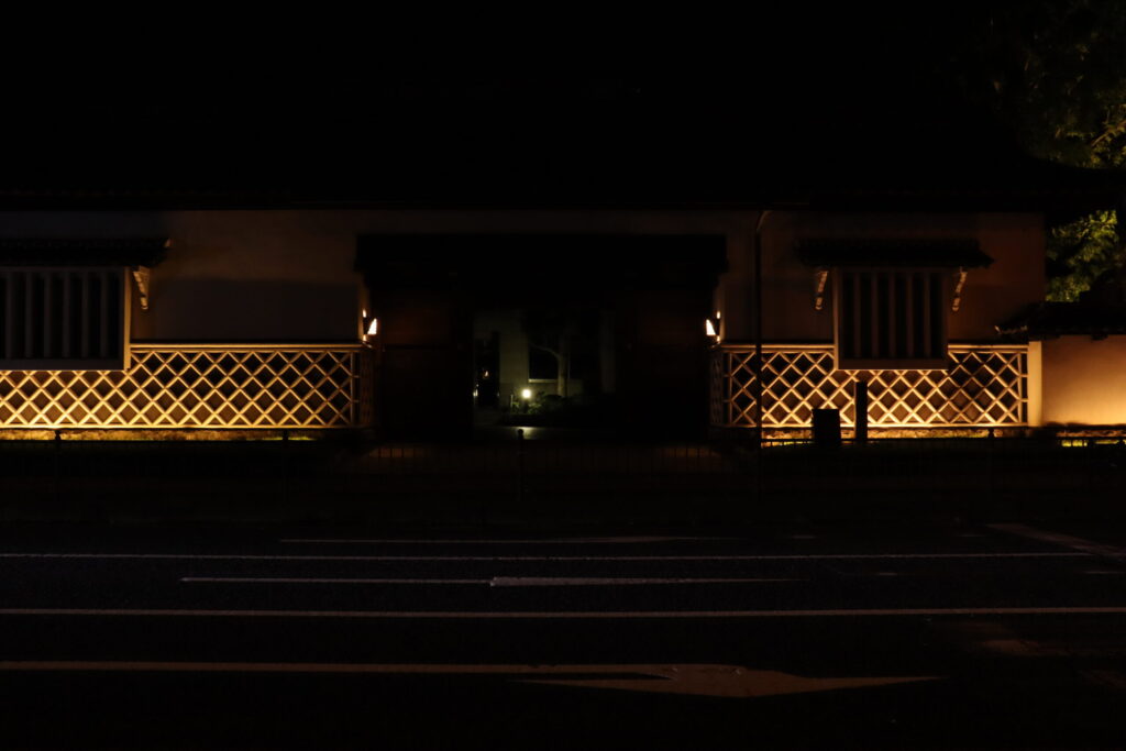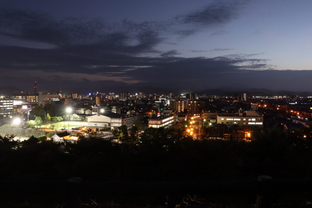 足下が覚束ない中を手探りで進みながら二の丸へ移っても、やはり誰一人いない。そこから眺める市街地の夜景は絶好のシャッターポイントだが、三脚も望遠レンズも用意していなかったので残念な撮影になってしまった。