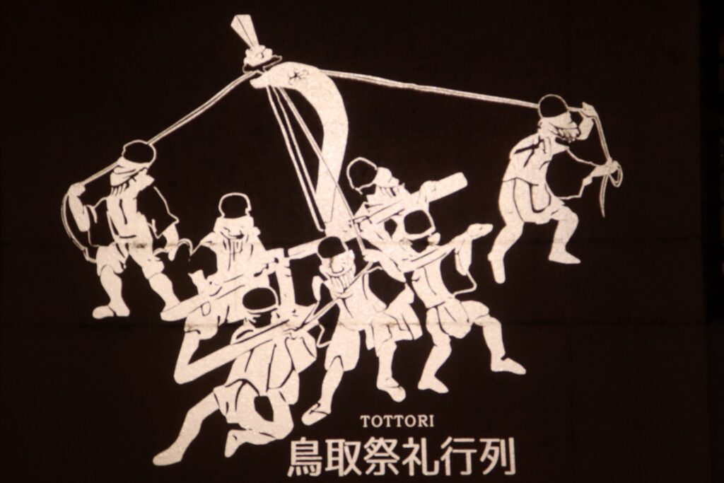 県庁前から商店街までの間は武家門や、並木道のライトアップ。そして、商店街のシャッターにはユニークな鳥取祭礼行列や、しゃんしゃん傘の影絵が投影されて市民がスマホで写している。