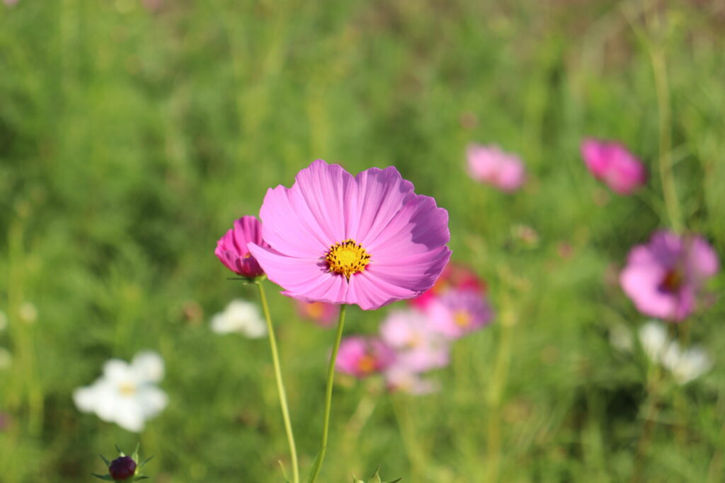 ピンクが綺麗なのは認めるが、先日まで撮っていた彼岸花の赤に比べるとインパクトには欠ける。ただ、ボカシ撮りで一輪の秋桜にピントを合わせると、一転して鮮やかなピンクが活きてくる。