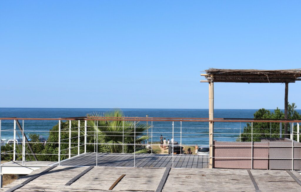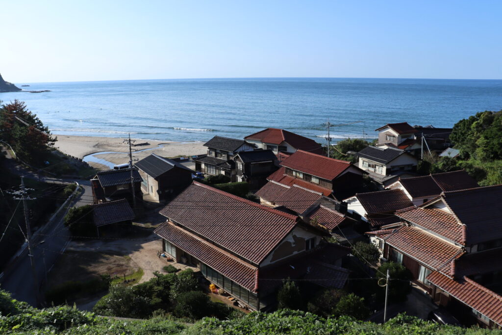 途中、小浜という海岸に下りてみる。そこもサーファーで溢れていたが、テトラポットと自然の岩が織り成す光景にシャッター。そして国道へ戻って見下ろす家々の瓦屋根の向こうに広がる青い空と海は、日本の原風景のようで撮らずにはいられない。