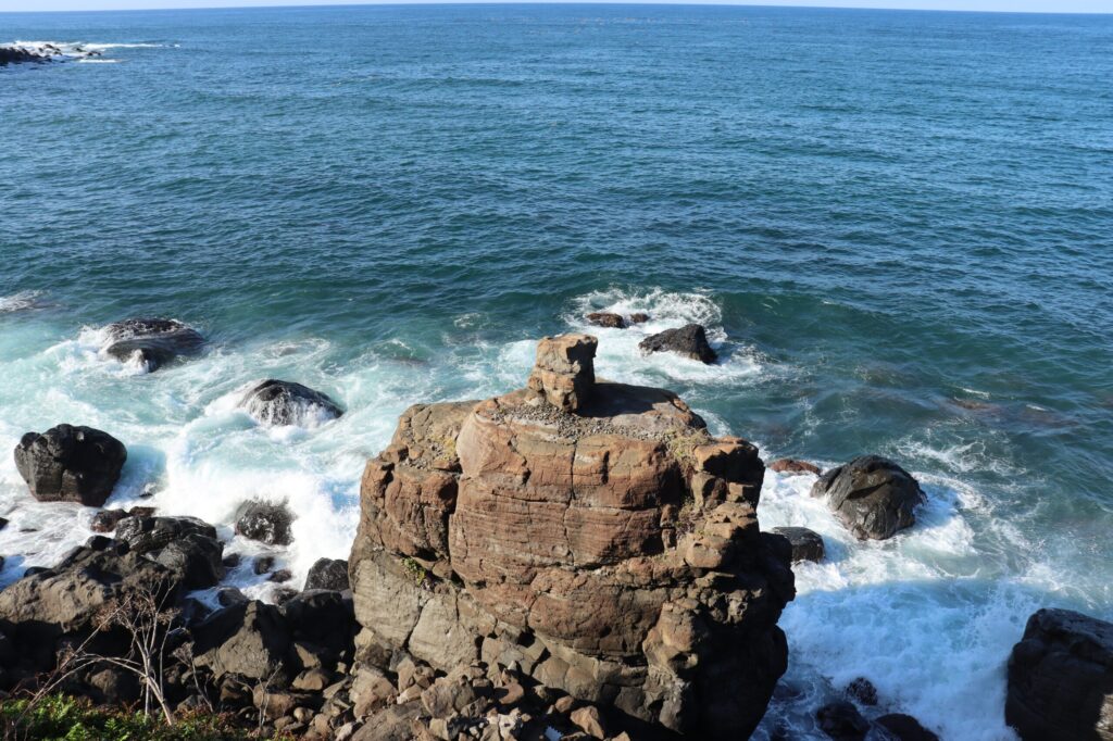 2、3枚写真を撮ってすぐに国道9号線を歩く。前回歩いた長和瀬までの途中も青い空と海に見惚れて再びシャッターを切ってしまう。長和瀬の堤防灯台から先は未知の光景。奇岩や、青い海に白い波飛沫と何キロ歩いても見飽きる事がない絶景。