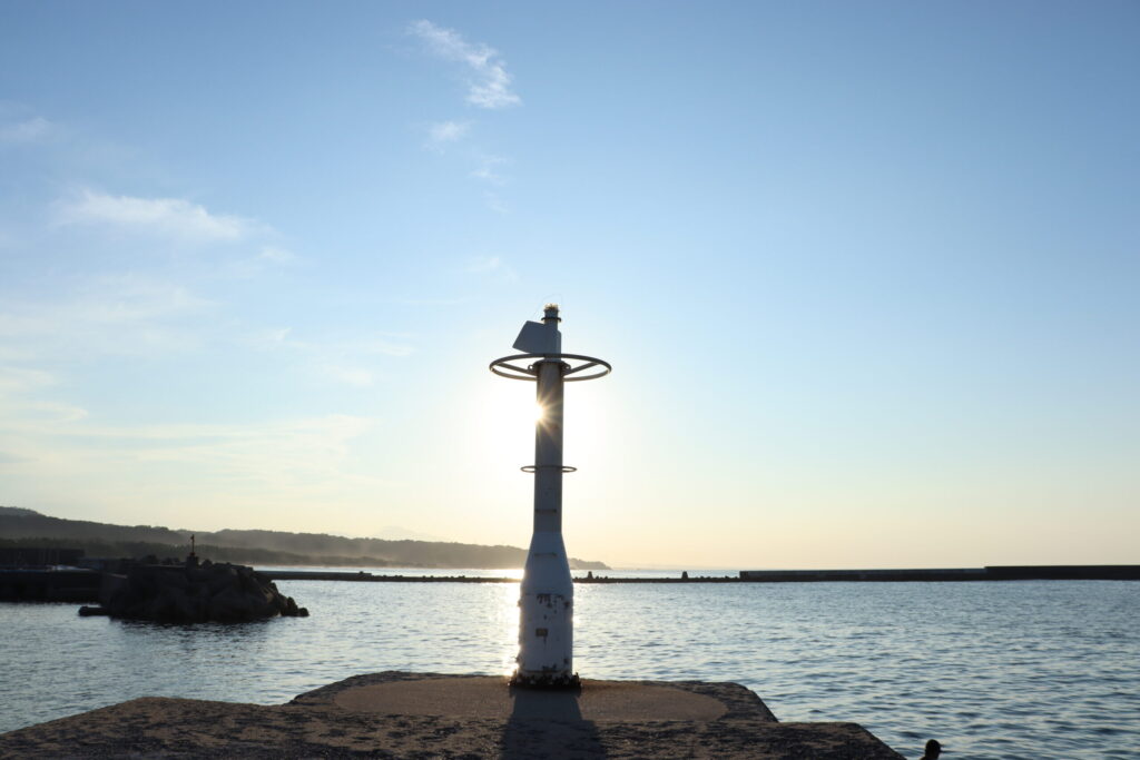 長く延びた堤防に上がって突端の灯台の前に腰を下ろす。内海の先には横切るような更に長い堤防。そして、日本海と長い岬。その上は徐々に色を変えていく秋の空。12キロを超える距離の疲れを癒やすように、ジッと座って夕暮れを待つ。