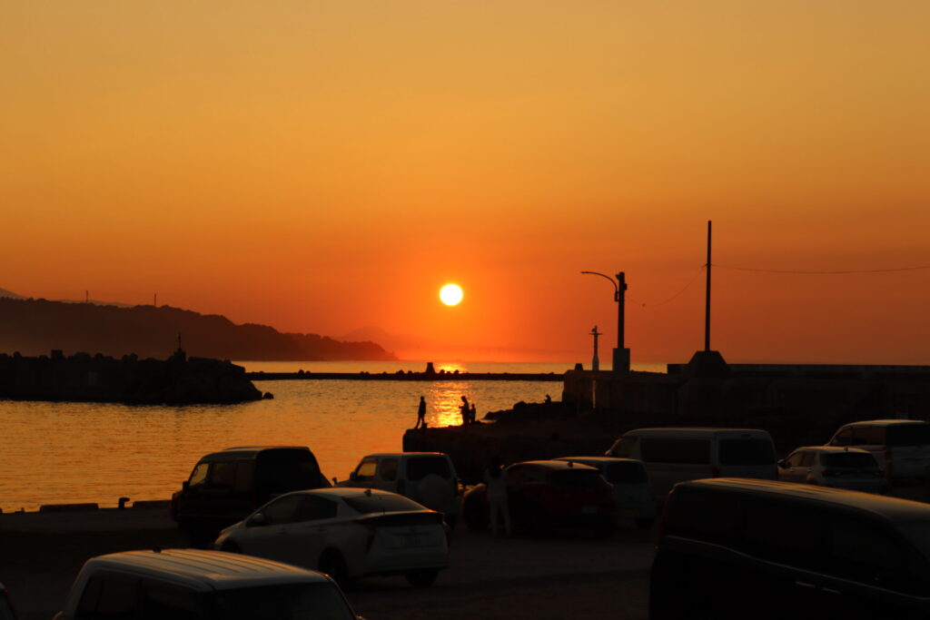 陽が落ちて空が茜色に染まり、オレンジ色の水光が私を突き刺すように真っ直ぐ伸びてくる。堤防と夕陽が重なった瞬間を撮って堤防を下りる。教えてくれた高台のスポットへ向かう。夕陽が沈む瞬間まで粘ってシャッターを切り続ける。