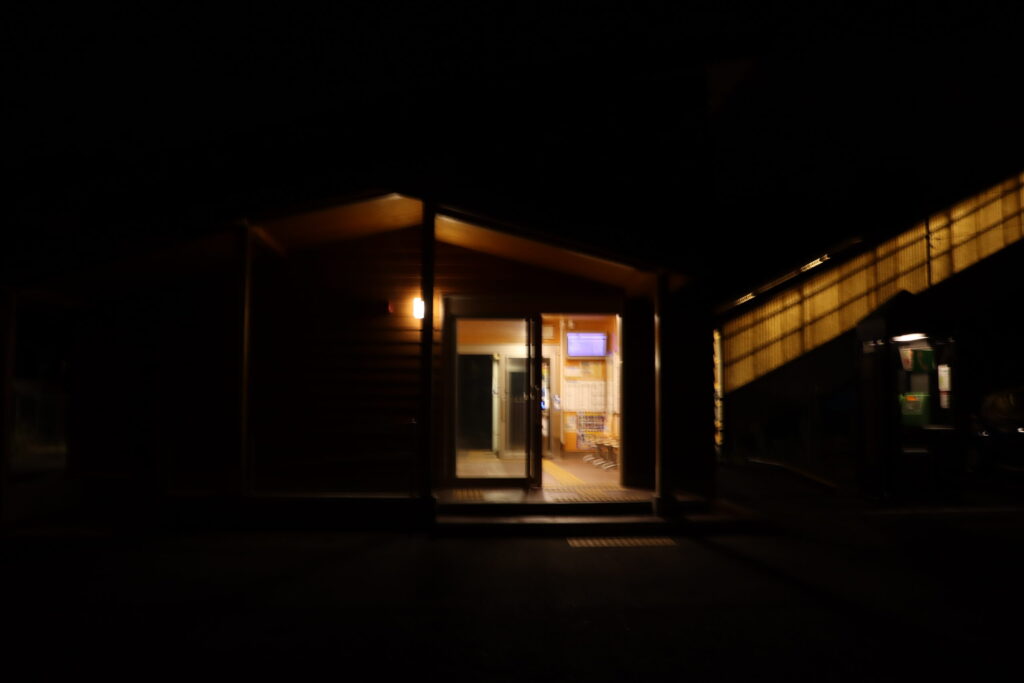 気が付くと、海は明るいのに陸は真っ暗。今度は犬と散歩中の女性が声を掛けてくる。親切に駅への分岐点まで歩いて教えてくれる。何とか真っ暗な駅前にたどり着いた。疲れたが絶景だけでなく、港町の人情に触れるウオーキング撮影だった。